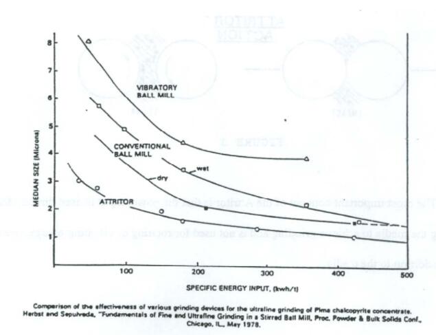 圖4顯示了各種研磨裝置對美國PIMA黃銅礦精礦進行超細研磨的效果比較。頂部曲線代表振動球磨機的數據;中間兩條曲線來自滾筒磨;底部曲線來自攪拌磨。如您所見,對于大約10千瓦時/噸的比能量輸入,通過使用攪拌磨獲得的D50比從滾筒磨獲得的小近50%,比從振動球磨機獲得的小約33%。