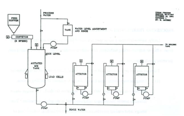 (2) SD干法攪拌磨與SL濕法攪拌磨的組合工藝(參見圖9)。在這種情況下,一個干法200-SD攪拌磨設置在連續(xù)模式下將鐵氧體預磨至-200目,再進入濕法200-SL攪拌磨中進行最終研磨。
