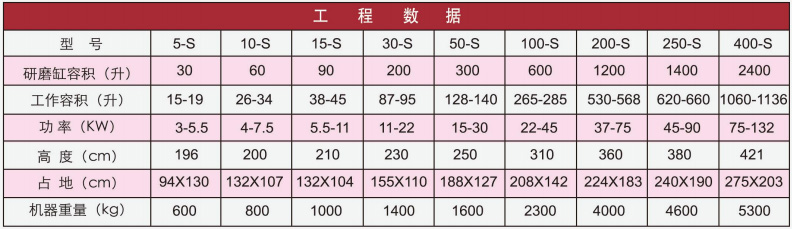 批量式生產用攪拌磨的代號為S型(standard)。若選用特制形狀的“L”型攪拌臂(此為選項件),機型的代號為SL。當攪拌磨加裝扭矩測量儀時,則在機型的代號的末尾加“T”。批量式攪拌磨的研磨缸容積為30升至2400升,電機功率為2KW至110KW。這些多功能的、操作簡便又便于維護的批量式攪拌磨已經成功地應用于各個領域,可用于研磨從巧克力到碳化鎢等多種不同的物料。攪拌磨還可以提供無金屬體系以保證產品無金屬離子污染,因此非常適合應用在要求苛刻的電子陶瓷行業(yè)。